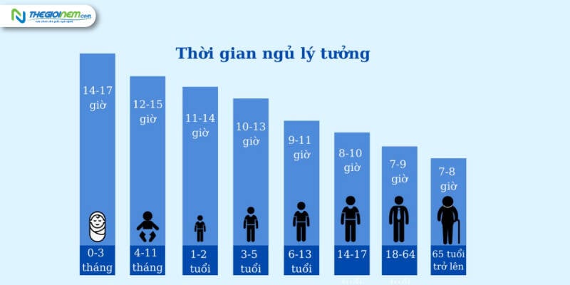 Khi mới sinh, trẻ em cần ngủ rất nhiều giờ trong ngày. Thời gian ngủ không cố định, thậm chí có trẻ ngủ vào ban ngày nhưng lại thức vào ban đêm. Bởi lúc này, trẻ chưa hình thành được một lịch sinh học ngủ nghỉ cụ thể. Ngoài ra, thời gian ngủ là khoảng thời gian quý báu để giúp cơ thể bé phát triển và hoàn thiện. Càng lớn lên, việc thay đổi giấc ngủ càng rõ ràng. Tổng thời gian ngủ một ngày của mỗi người sẽ giảm xuống và khi về già, nhiều người khó mà tìm thấy được một giấc ngủ ngon bởi các yếu tố về hormone, sức khỏe,... Cụ thể: