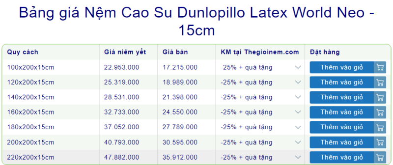 3. Bảng giá nệm cao su thiên nhiên Dunlopillo
