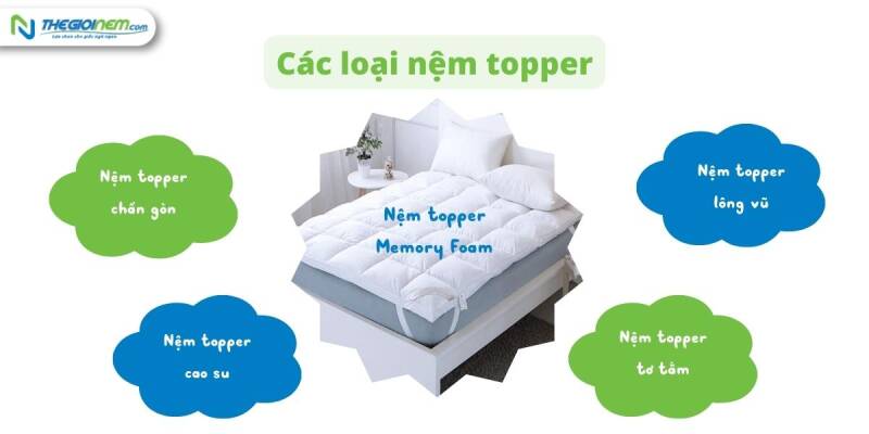 Ngày nay, do nhu cầu sử dụng nệm topper ngày càng lớn và sự cạnh tranh có tỷ lệ gia tăng mạnh mẽ trên thị trường, các thương hiệu đã cho ra đời nhiều loại nệm topper được làm bằng các chất liệu khác nhau. Nhưng phổ biến nhất thì phải kể đến các loại sau:
