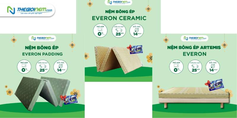 Thương hiệu nệm Everon cung cấp cho thị trường những bộ chăn ga gối nệm có nguồn gốc tự nhiên, an toàn cho da, không gây dị ứng cho giấc ngủ êm ái nhất. Everon lấy việc chăm sóc từng giấc ngủ làm sứ mệnh của mình, trở thành đối tác tin cậy giúp khách hàng có giấc ngủ ngon mỗi ngày. Chất lượng của các sản phẩm không chỉ là chất liệu, tính năng mà còn là thiết kế, màu sắc, họa tiết để tạo nên sản phẩm có tính thẩm mỹ cao nhất.