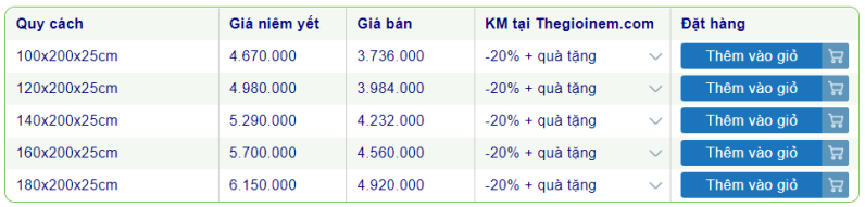 Giữa muôn vàn các dòng nệm, thương hiệu nệm khác nhau, khách hàng thường gặp khó khăn trong việc đưa ra quyết định. Do đó, Thế Giới Nệm đã tập hợp bảng giá nệm lò xo được ưa chuộng nhất để khách hàng dễ dàng tham khảo và chọn mua:
