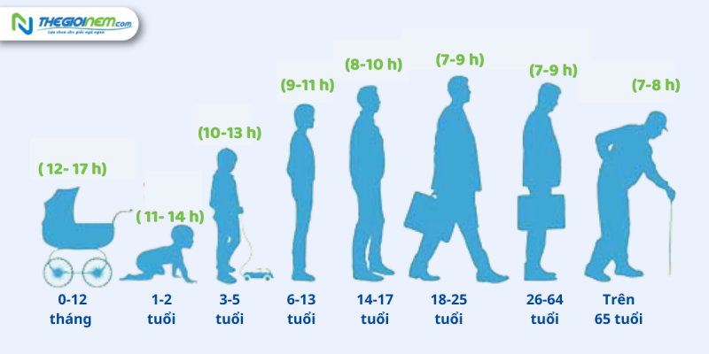 Trẻ em giai đoạn phát triển cần được ngủ nhiều hơn để phóng thích hormone tăng trưởng, nhất là ở giai đoạn sơ sinh giai từ 1 - 11 tháng tuổi. Ngược lại, khi càng cao tuổi, người ta sẽ cảm thấy khó khăn hơn để đi vào giấc ngủ và thời lượng giấc ngủ cũng giảm dần. Cụ thể: