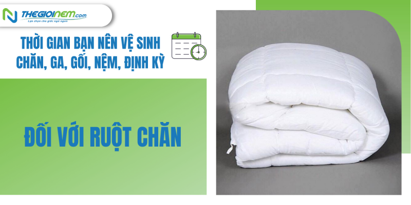 - Đối với ruột chăn, bạn nên giặt 1 lần trong 1 năm. Ruột chăn bạn nên giặt khô chứ không nên giặt bằng máy hoặc bằng tay. Nếu không bị ố bẩn thì bạn chỉ cần phơi dưới ánh nắng mặt trời. Ánh nắng mặt trời sẽ giúp tiêu diệt các vi khuẩn và mầm mống bệnh vẫn còn sót lại ở trong chăn.